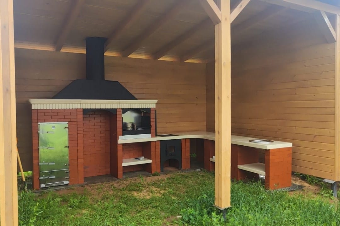 Мангал "BBQ64" с печью под казан разделочным столом и мойкой солома кирпич